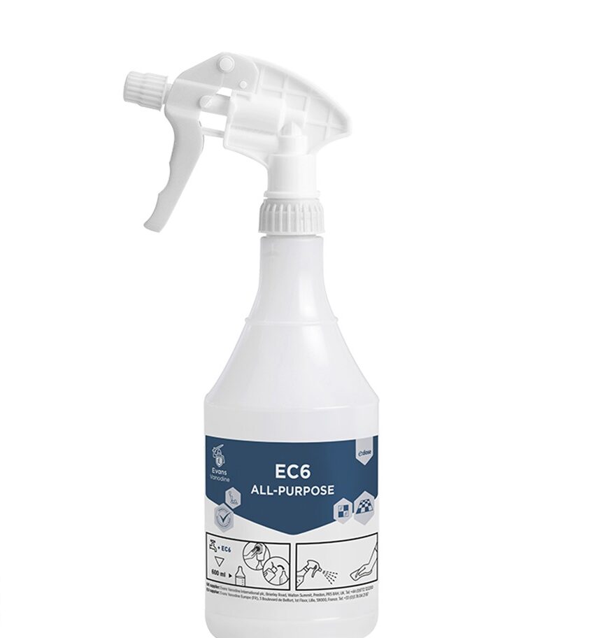 All-Purpose Trigger Spray For use with ready made up a solution of EC6 All-Purpose Pre-printed, coulour-coded bottle Shows dilution rates and usage Comes with an adjustable jet spray head