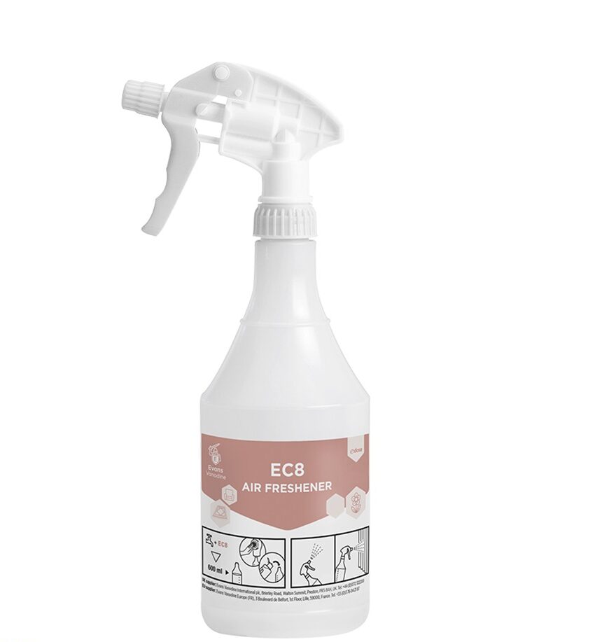 Spray Bottle & Trigger For use with ready made up solution of EC8 Air Freshener Pre-printed, colour-coded bottle Shows dilution rate and usage Comes with adjustable jet spray head